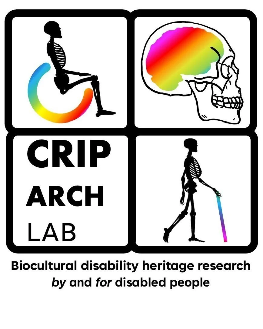 Crip Archaeology Lab Logo: a four-part square logo with three visual representations of disability and the text reading “Crip Arch Lab” and a subtitle: “Biocultural disability heritage research by and for disabled people.” The visual representations (clockwise) show (1) a skeleton-person in a rainbow wheelchair, (2) a neanderthal skull with rainbow brain, and (3) a skeleton-person walking with a rainbow cane. These different icons represent the different research streams included in our lab: narrating disability stories through bio/archaeology, investigating neurodiversity and descriptive disability in deep time, and quantifying skeletal health and mobility for disabled bodies, to better understand disabled peoples’ health.